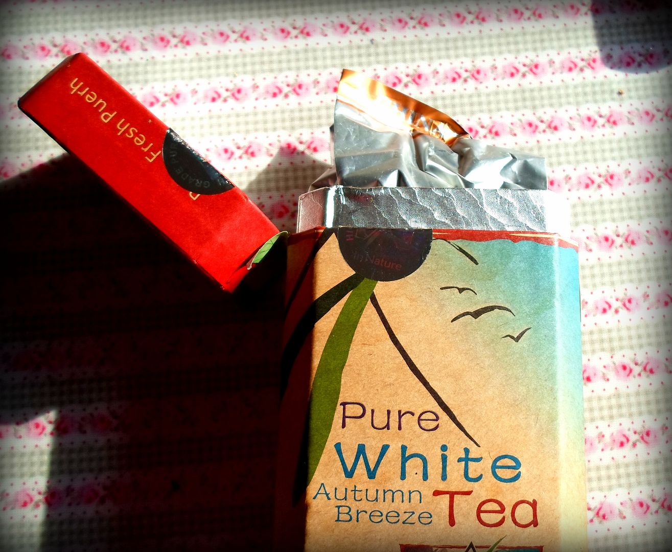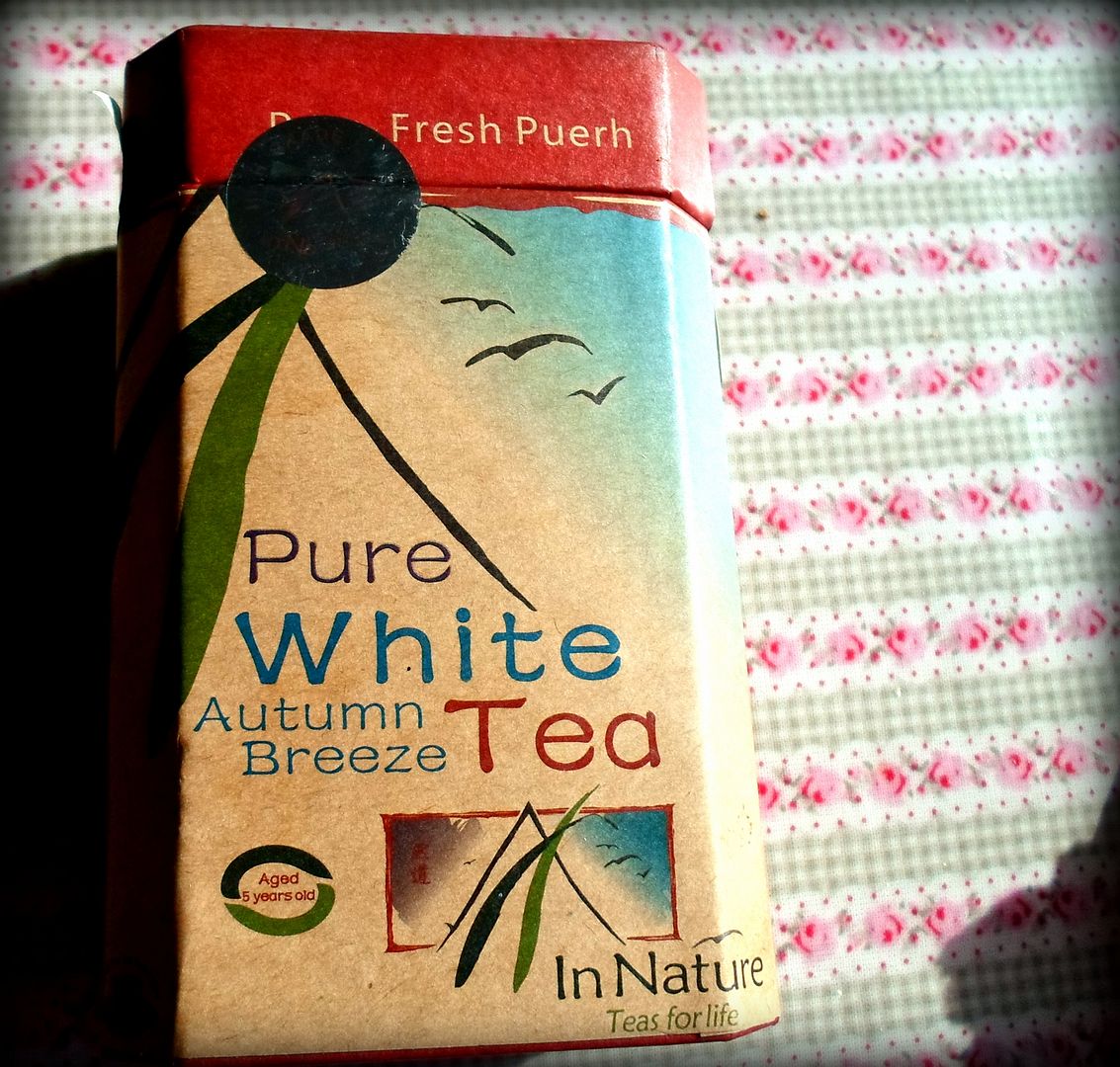 The variety they had sent me was the Pure White Tea, Autumn Breeze. It came in a sturdy cardboard and foil lined tea caddy, and was enclosed in a foil bag inside the tea caddy.