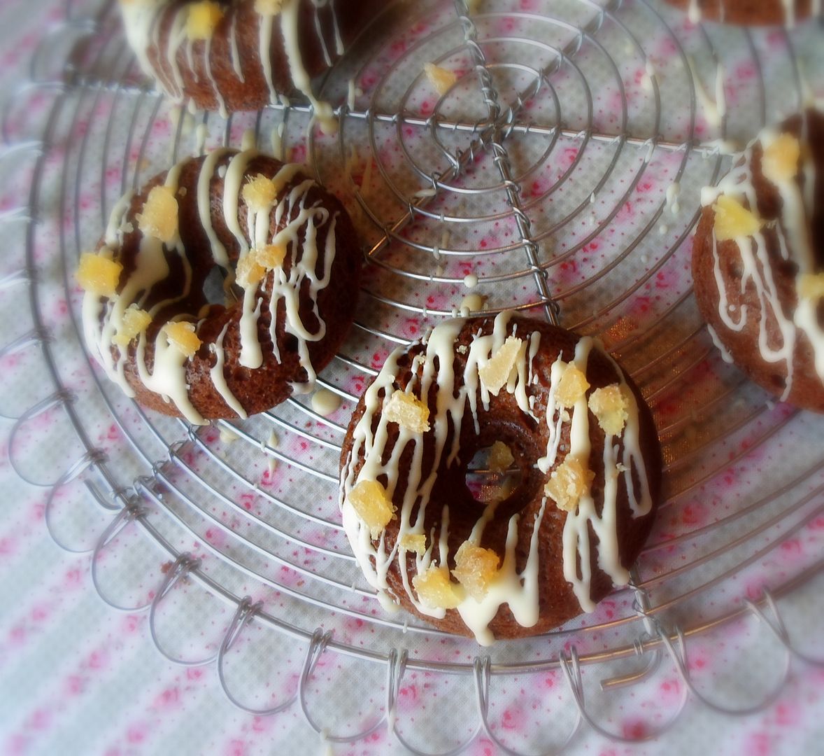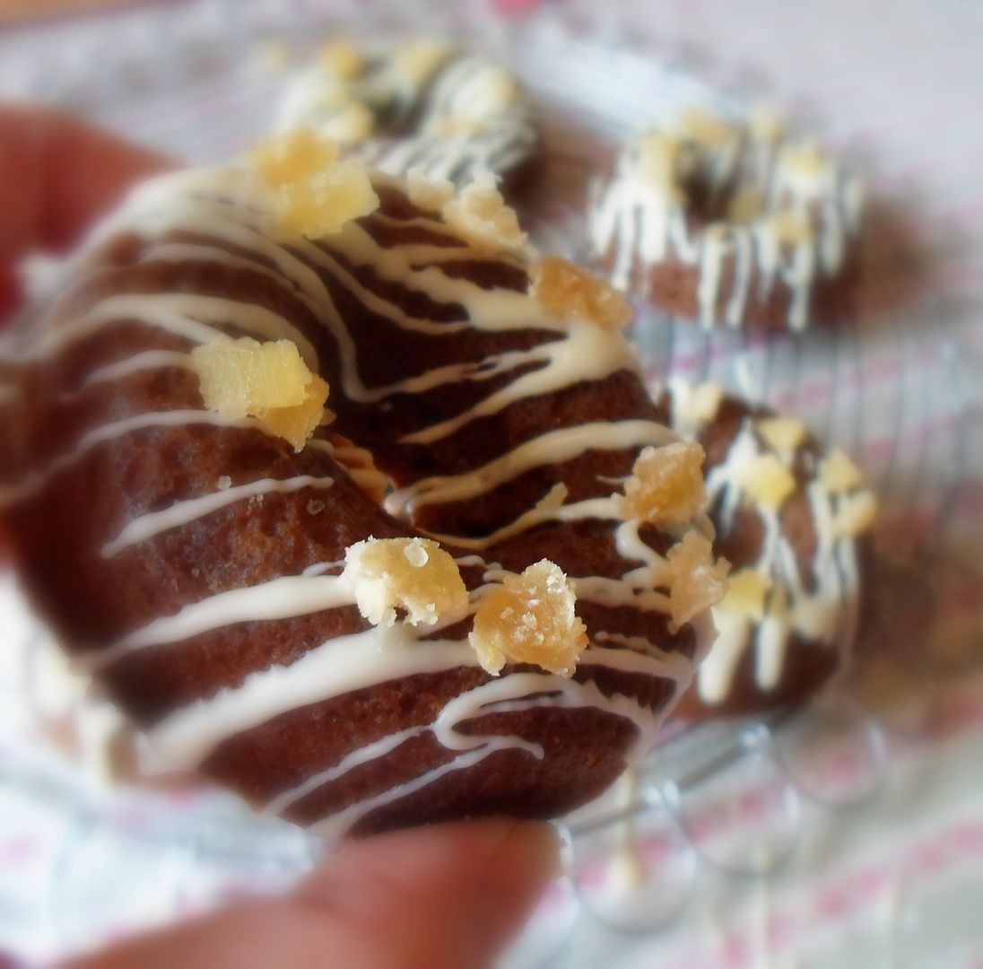 Once they are all baked, melt your chocolate chips, according to your package directions. Drizzle the melted chocolate over top of the donuts and sprinkle with chopped ginger before it sets. Allow to set completely before serving. Store any leftovers in a tightly covered container.