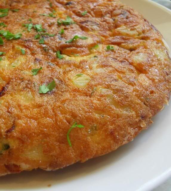 A tortilla, not to be confused with a flat type of bread eaten in Mexico, is like the Spanish version of an Italian Frittata. A tortilla however, is thicker and has potatoes in it. This is delicious served hot, warm or at room temerature. It's not so good cold though.